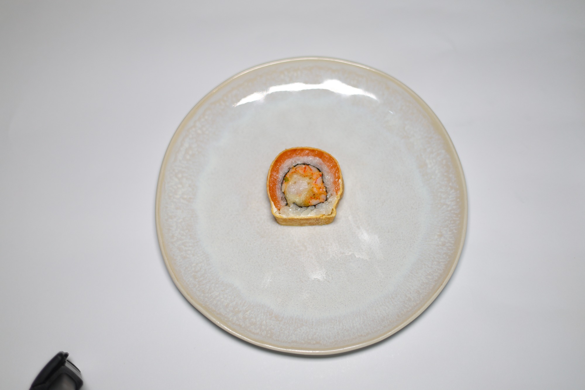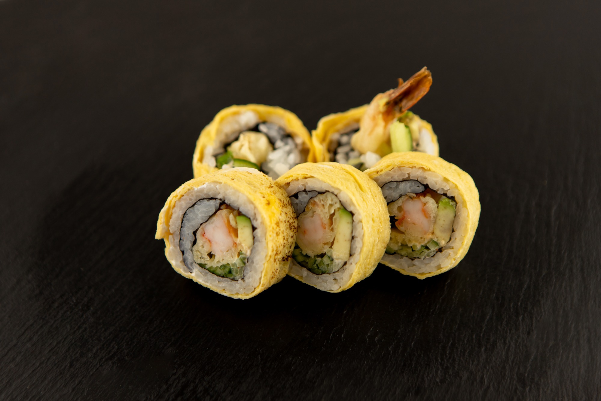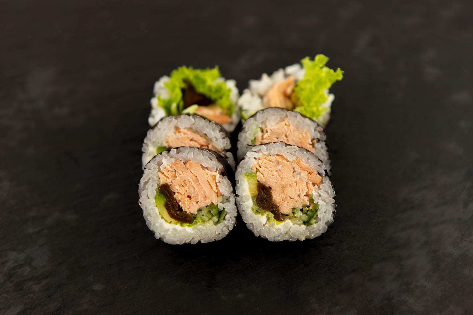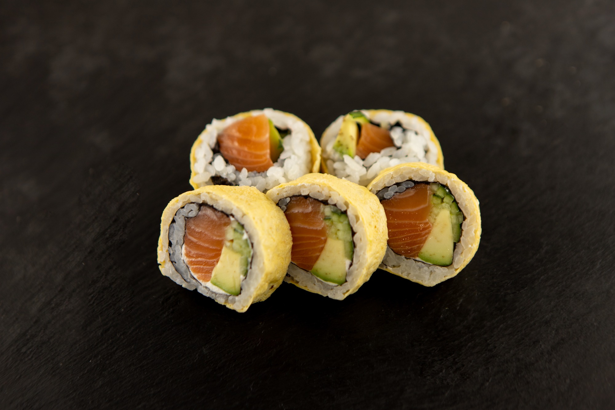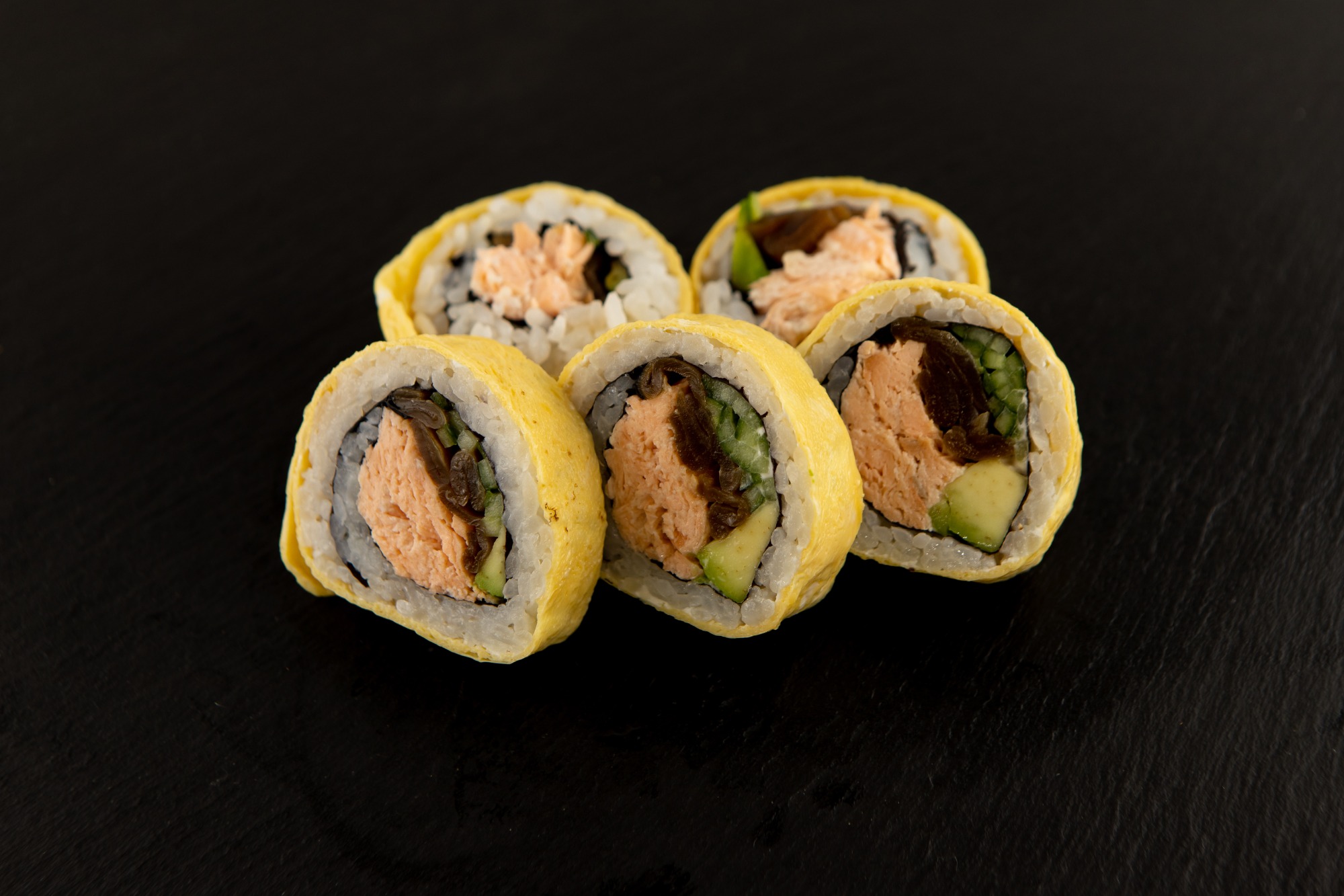 Rolka zawijana odwrotnie, z ryżem na zewnątrz oraz nori wewnątrz, dzielone na 5 szt.