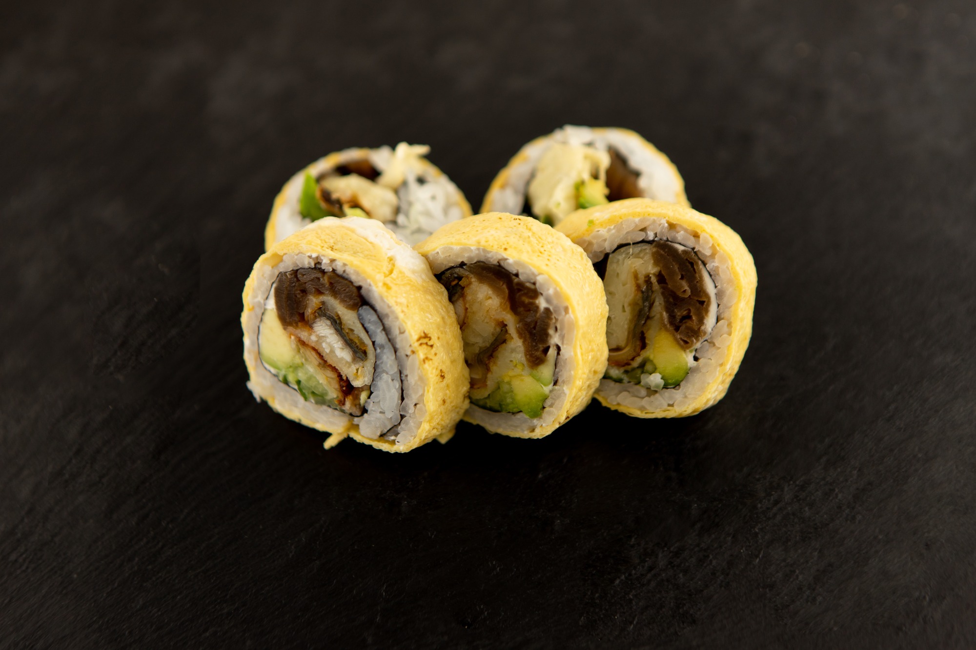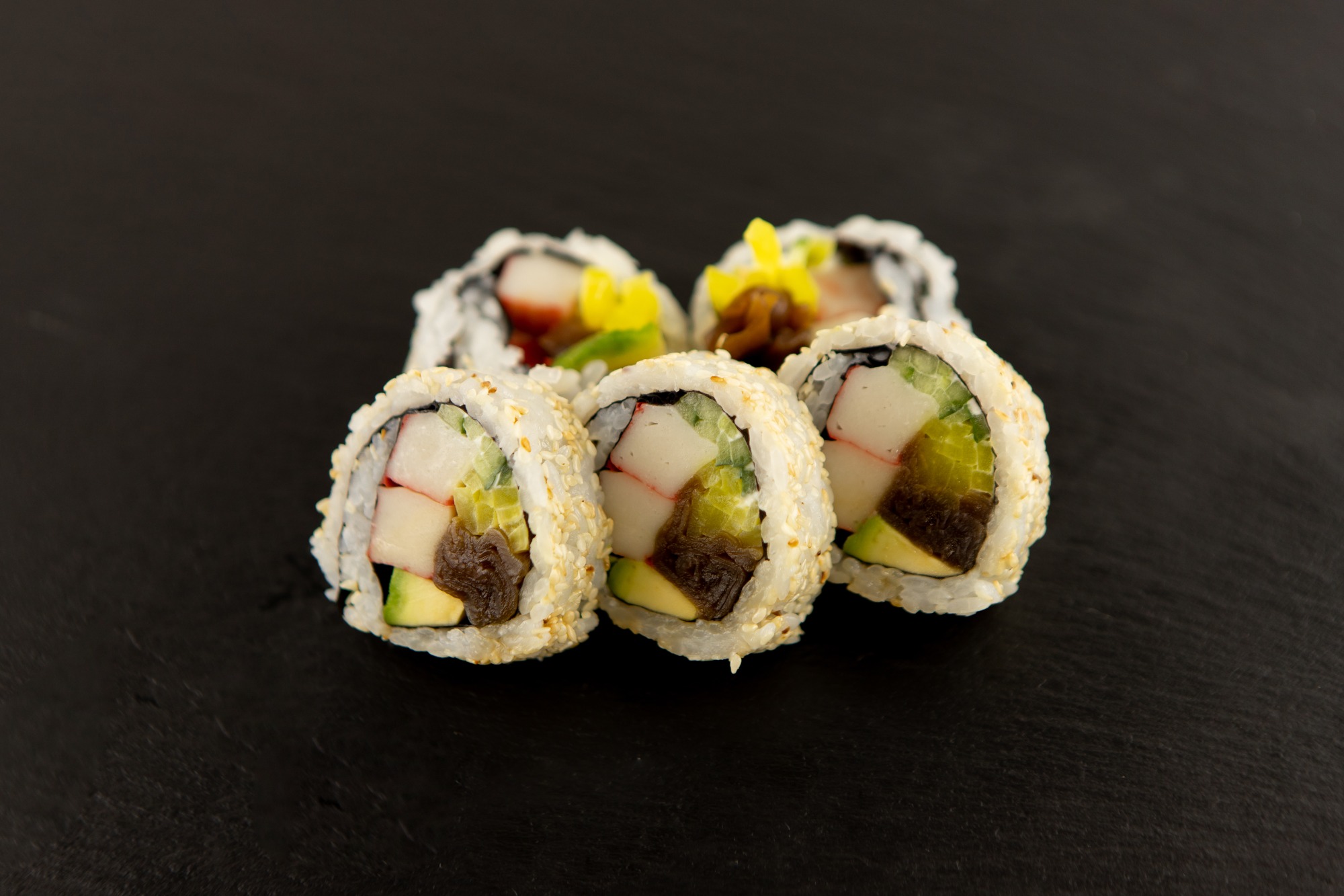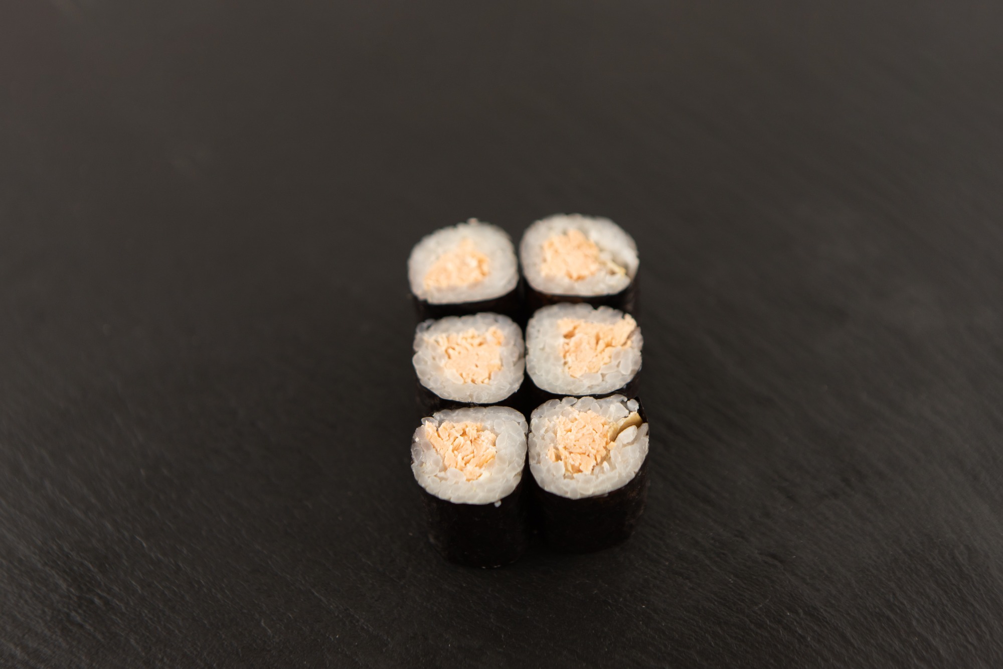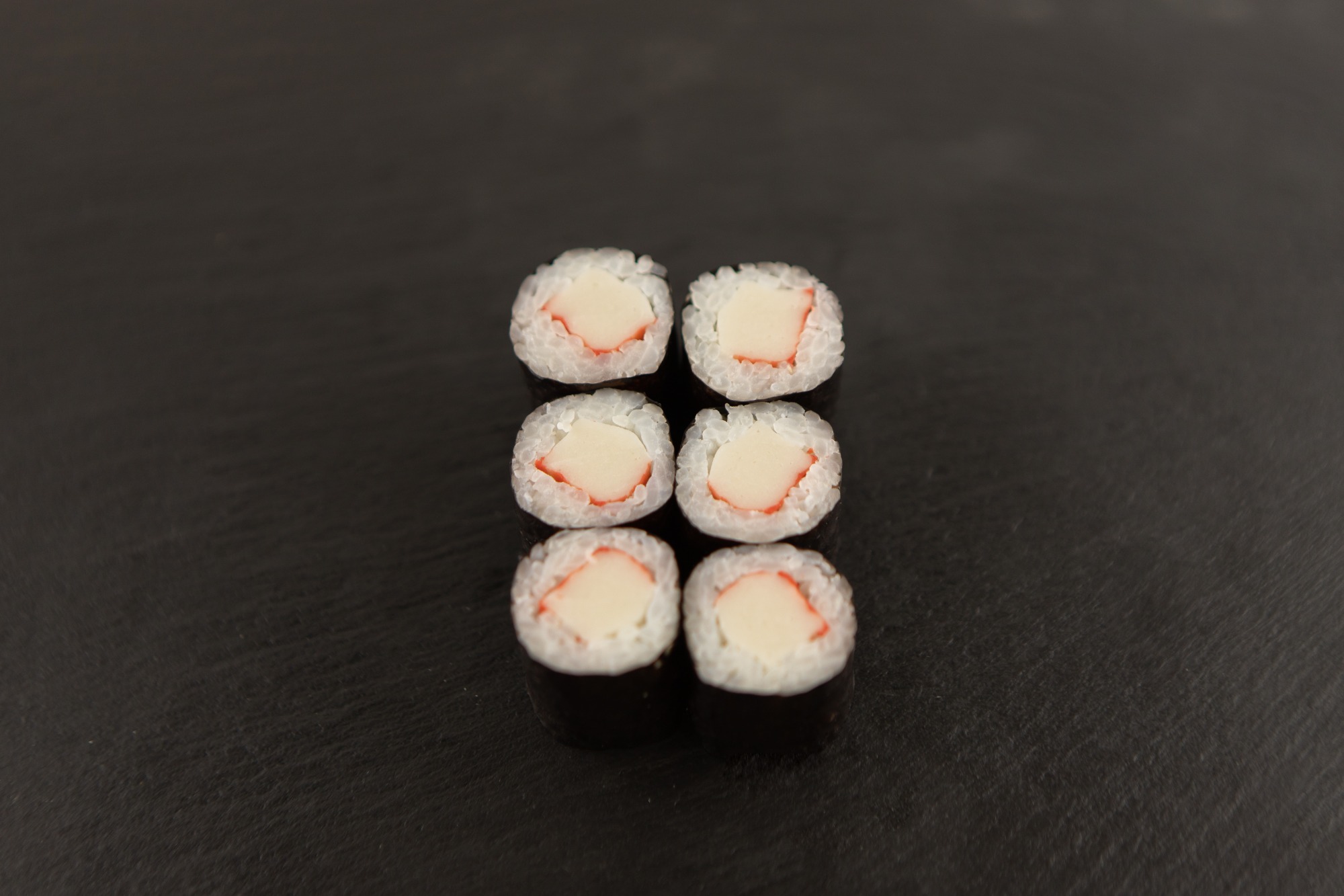Rolka zawijana odwrotnie, z ryżem na zewnątrz oraz nori wewnątrz, dzielone na 5 szt.