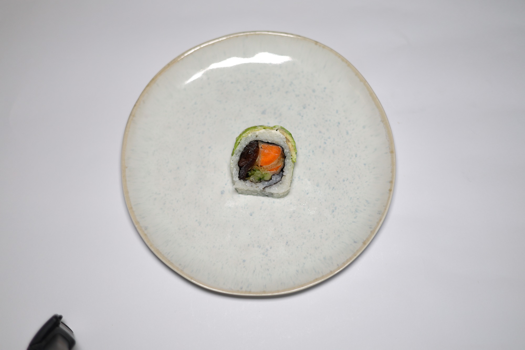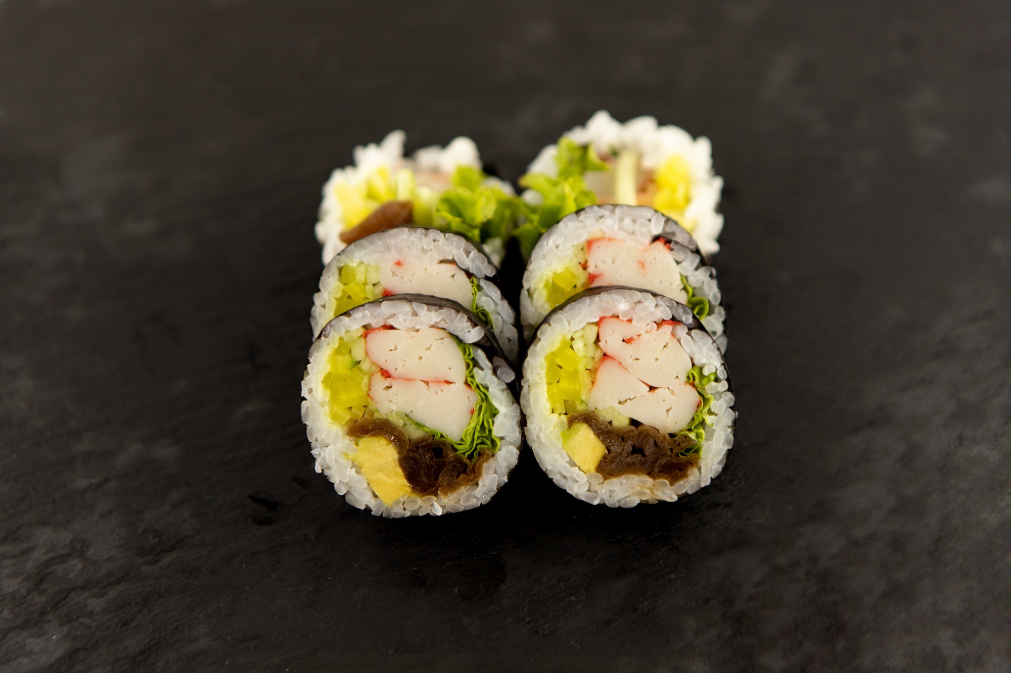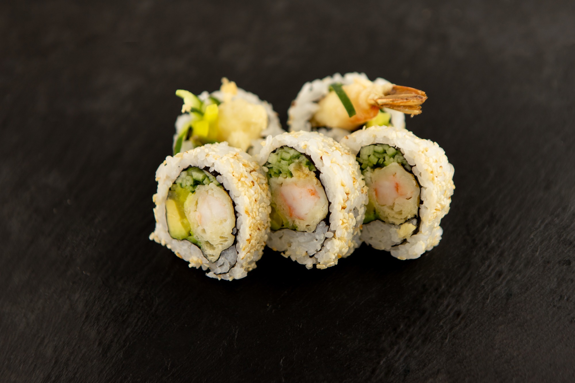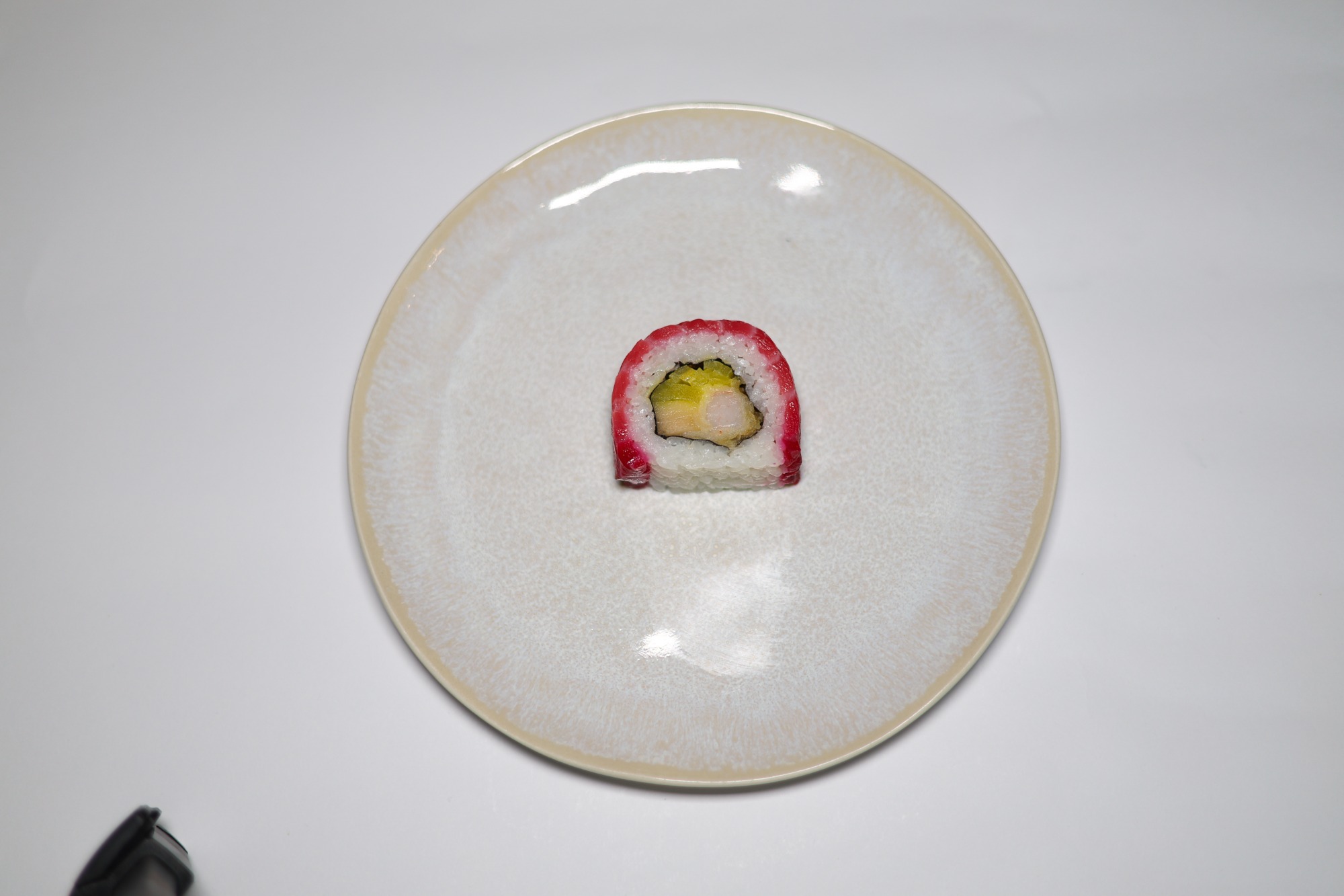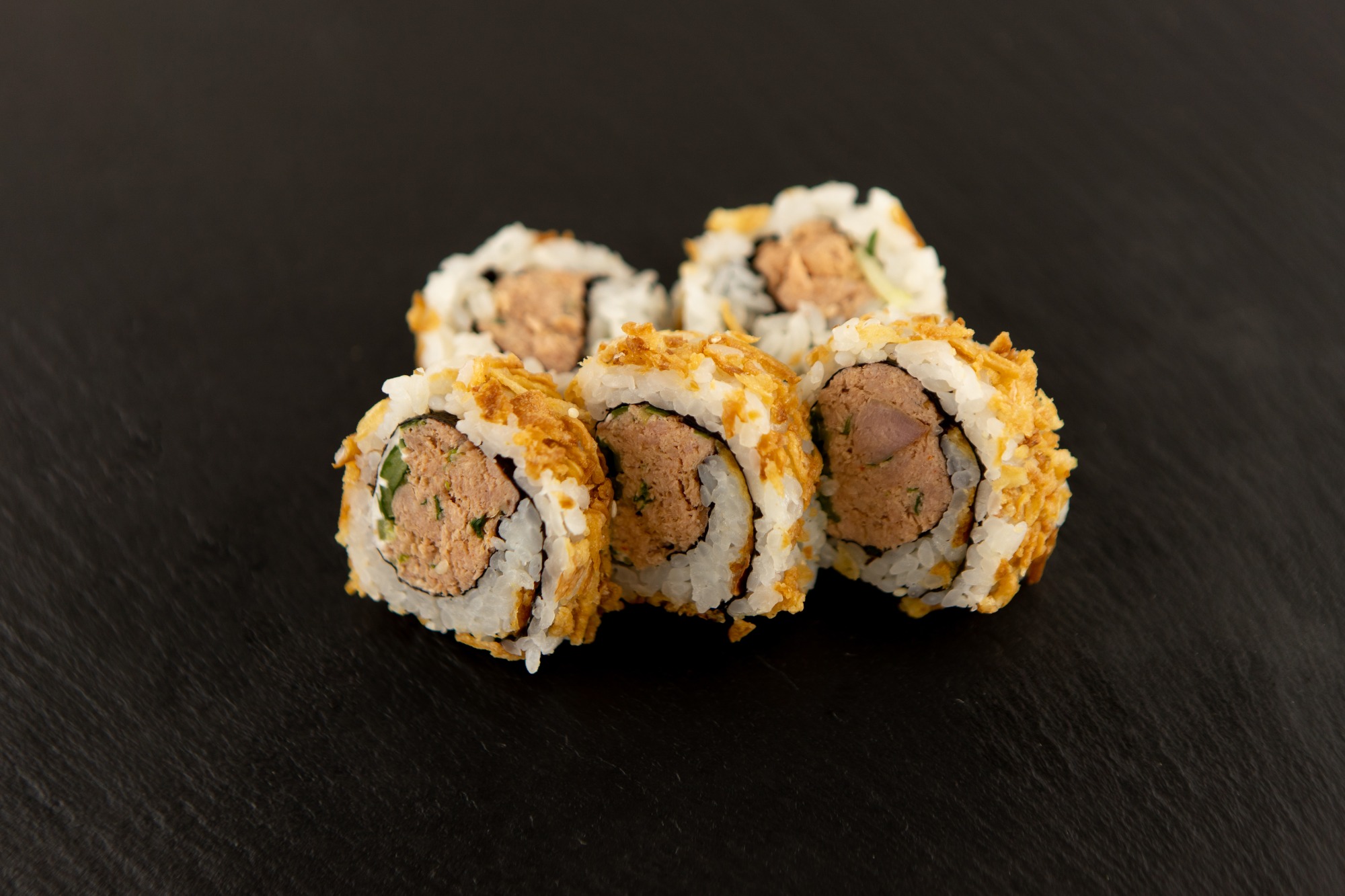 Rolka zawijana odwrotnie, z ryżem na zewnątrz oraz nori wewnątrz, dzielone na 5 szt.
