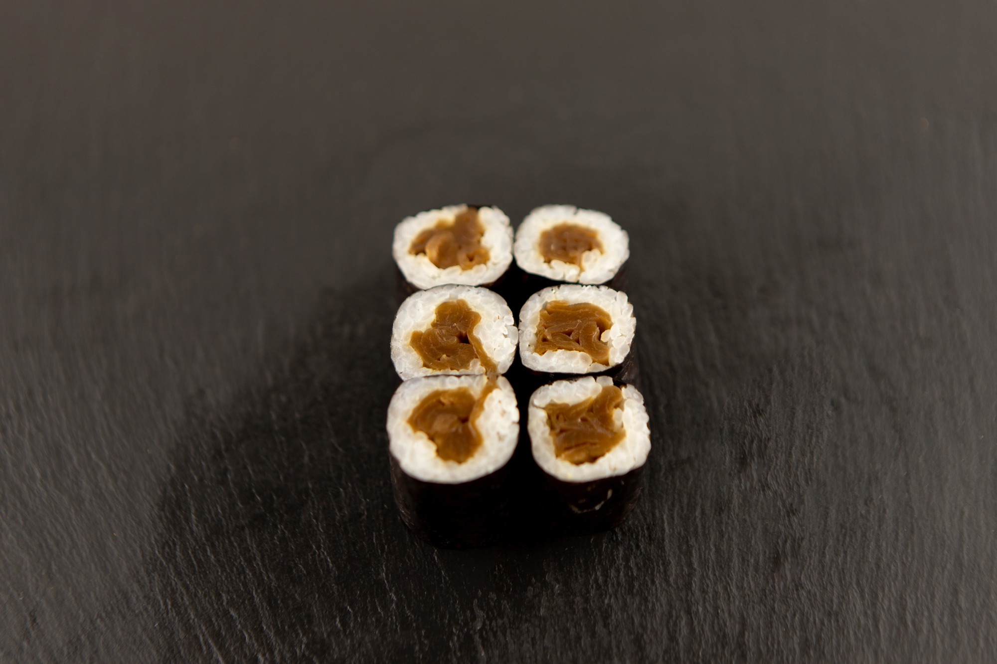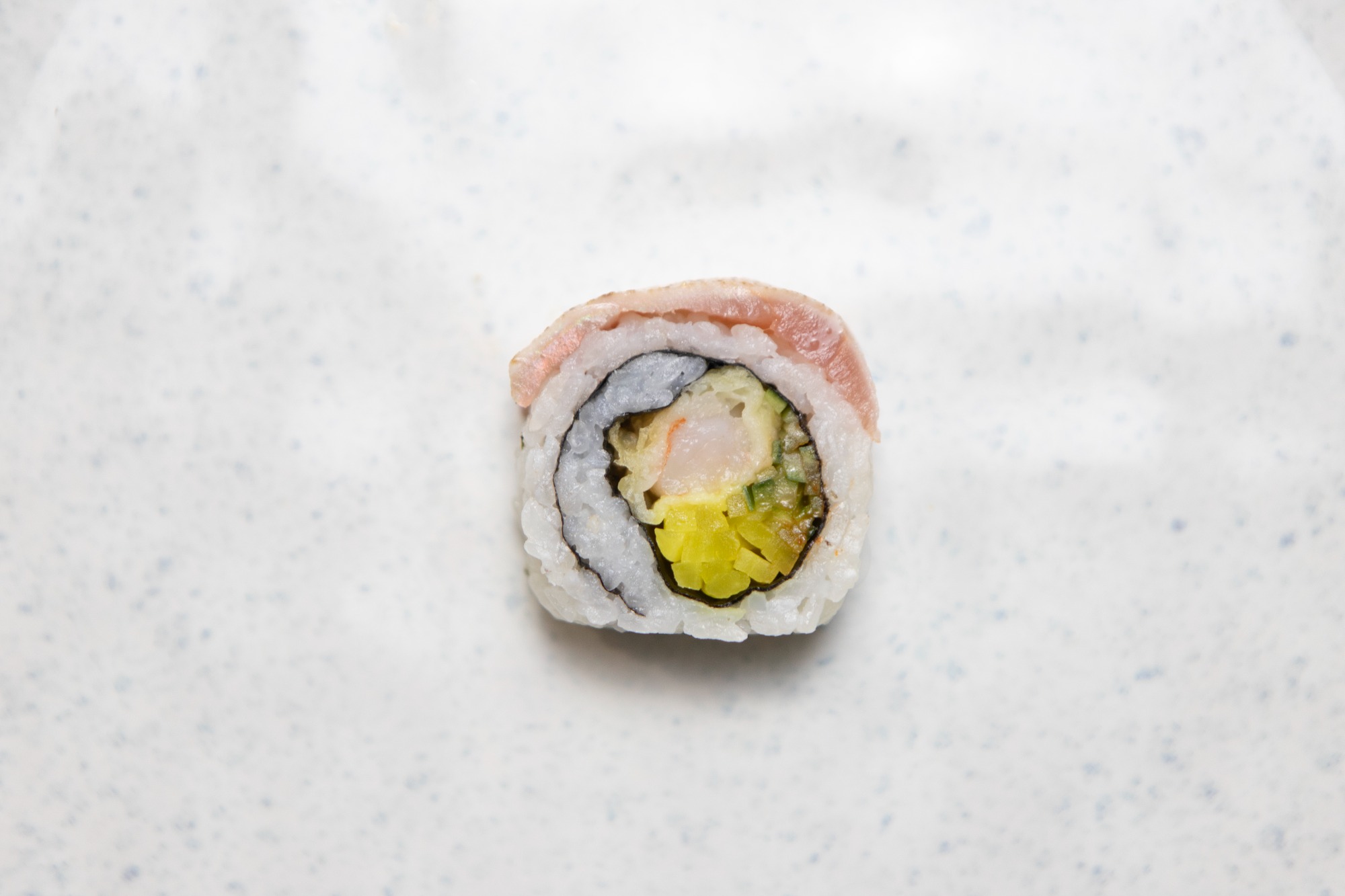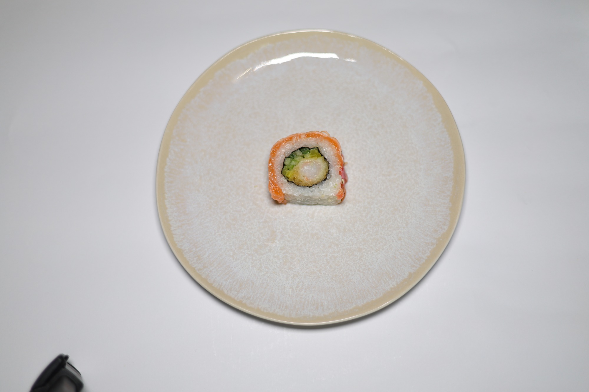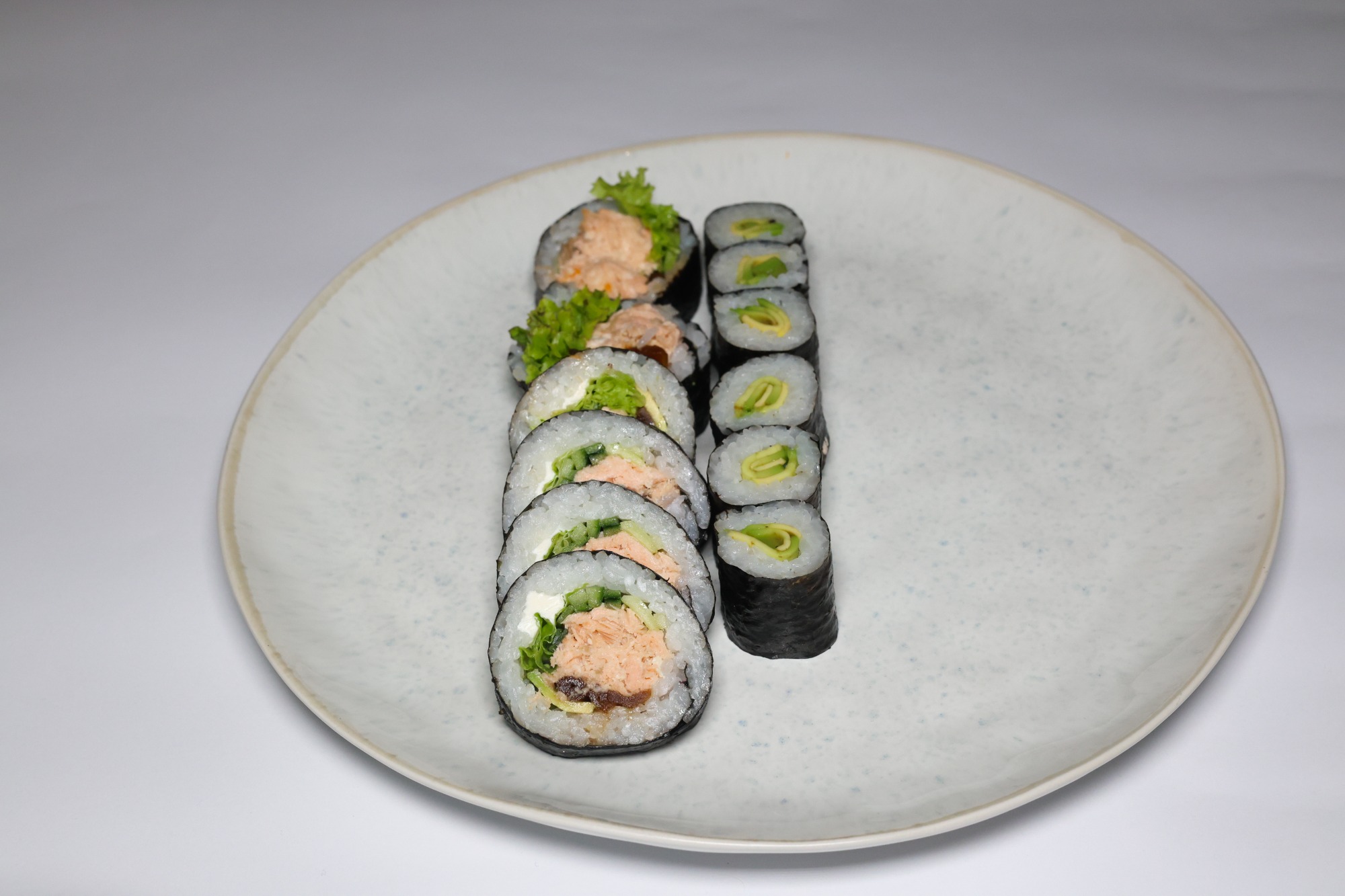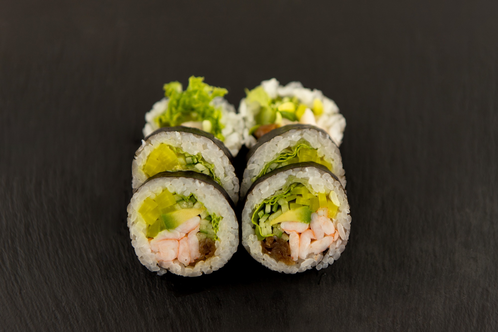 Rolka zawijana odwrotnie, z ryżem na zewnątrz oraz nori wewnątrz, dzielone na 5 szt.