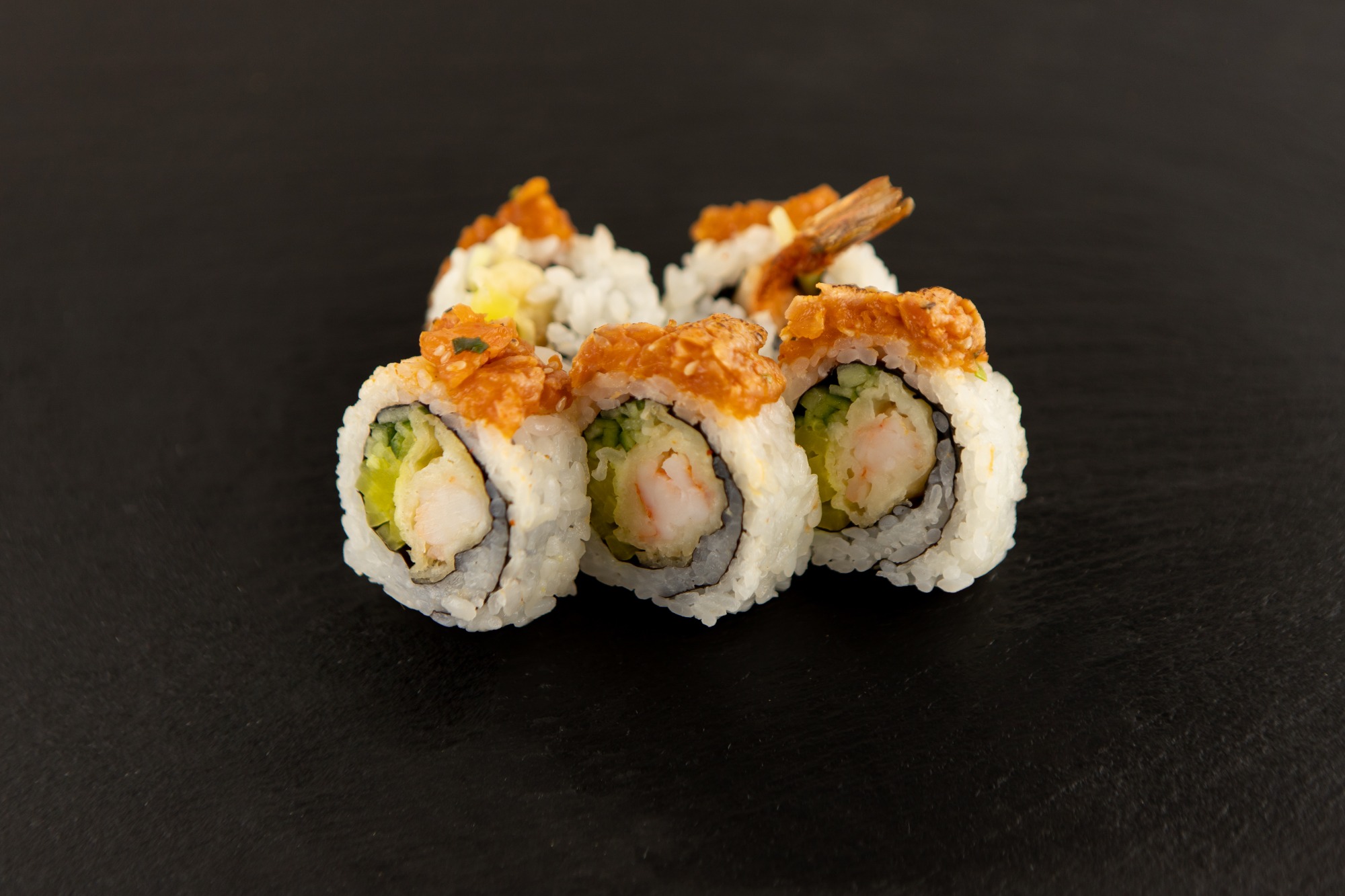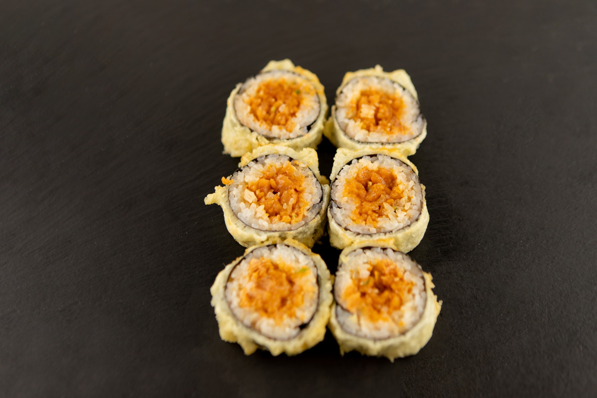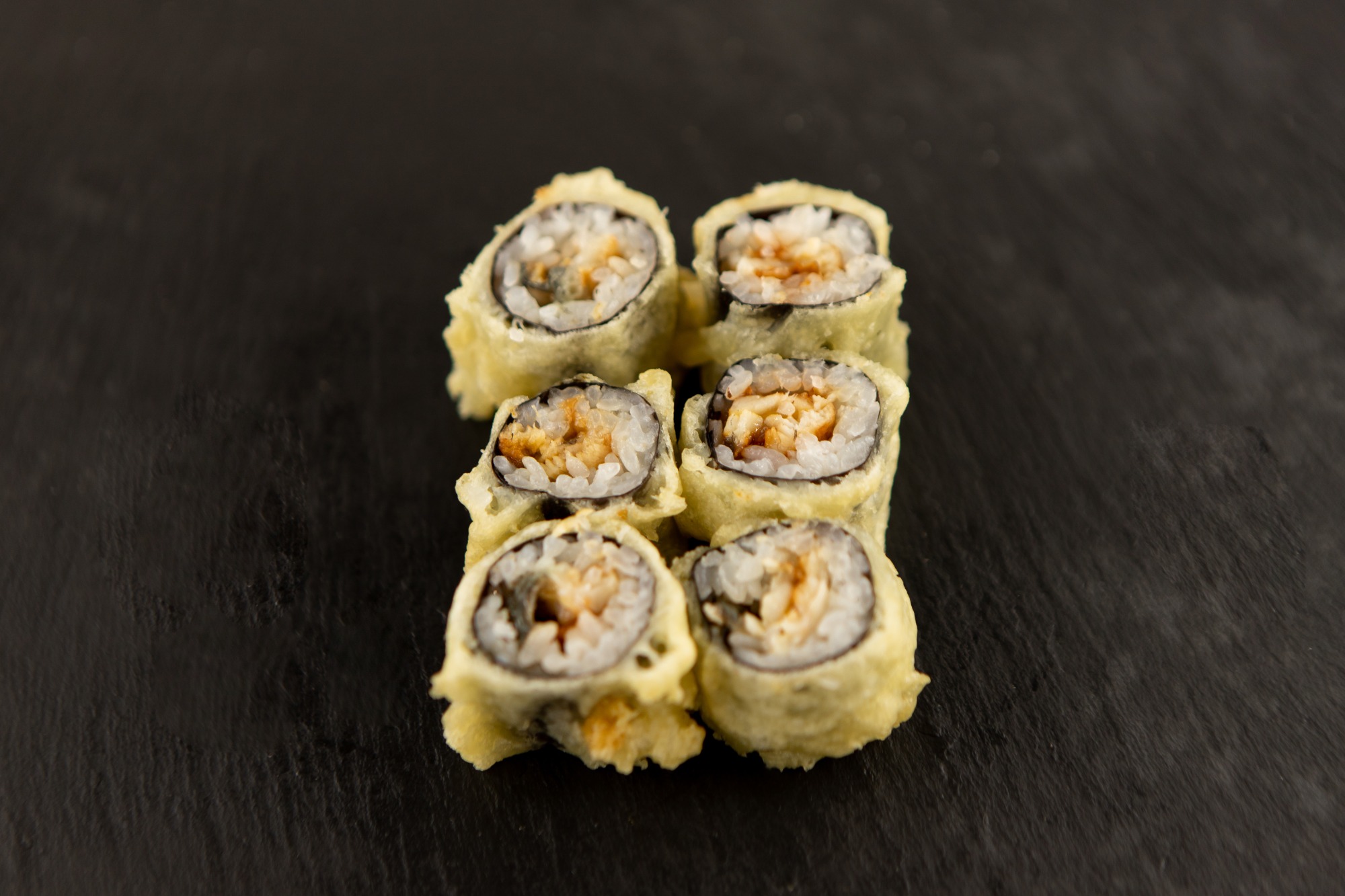 łosoś, cała rolka w tempurze, sos kabayaki, migdały