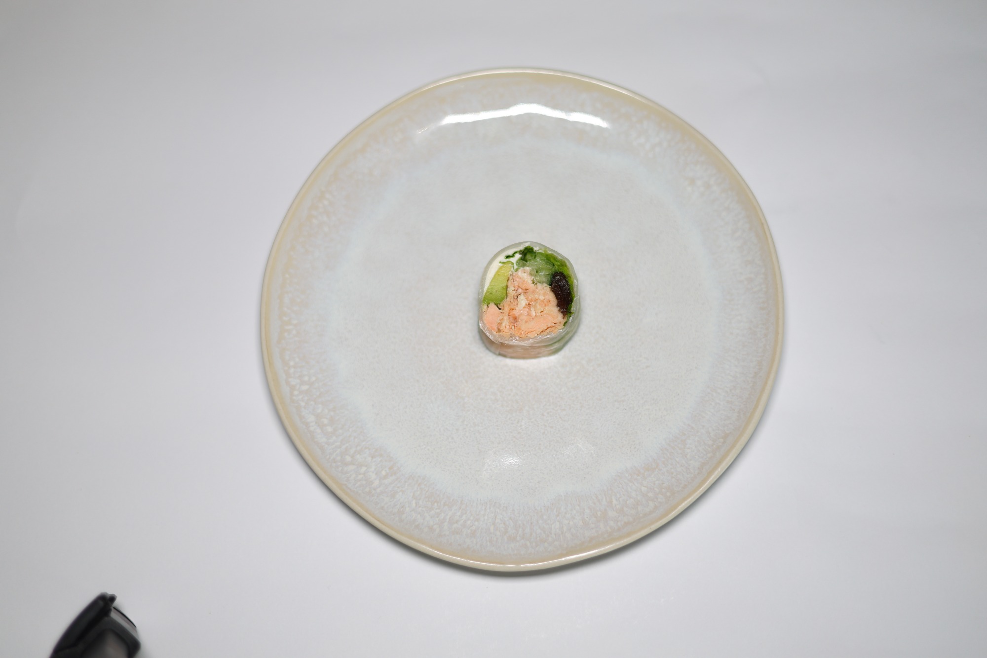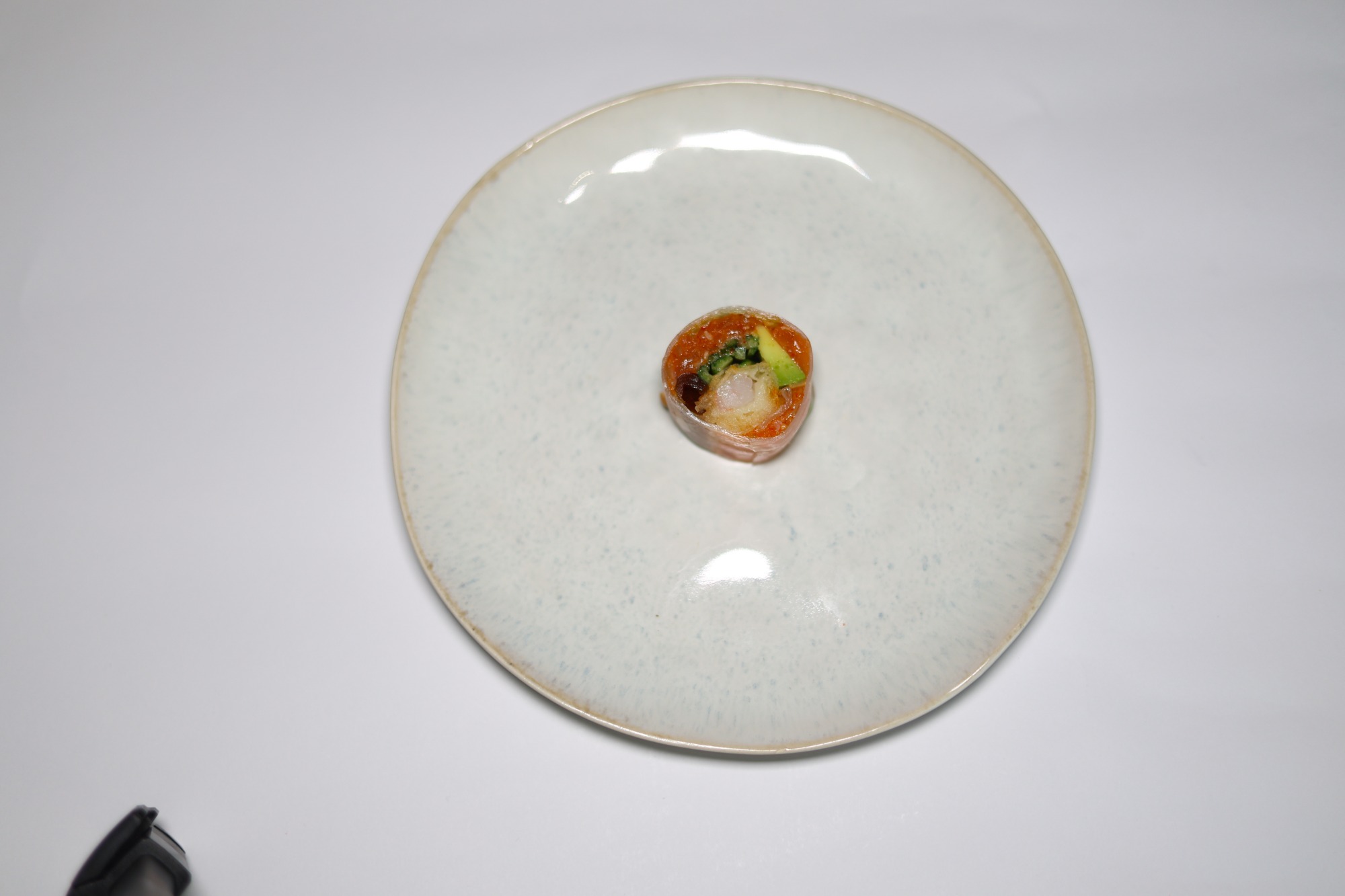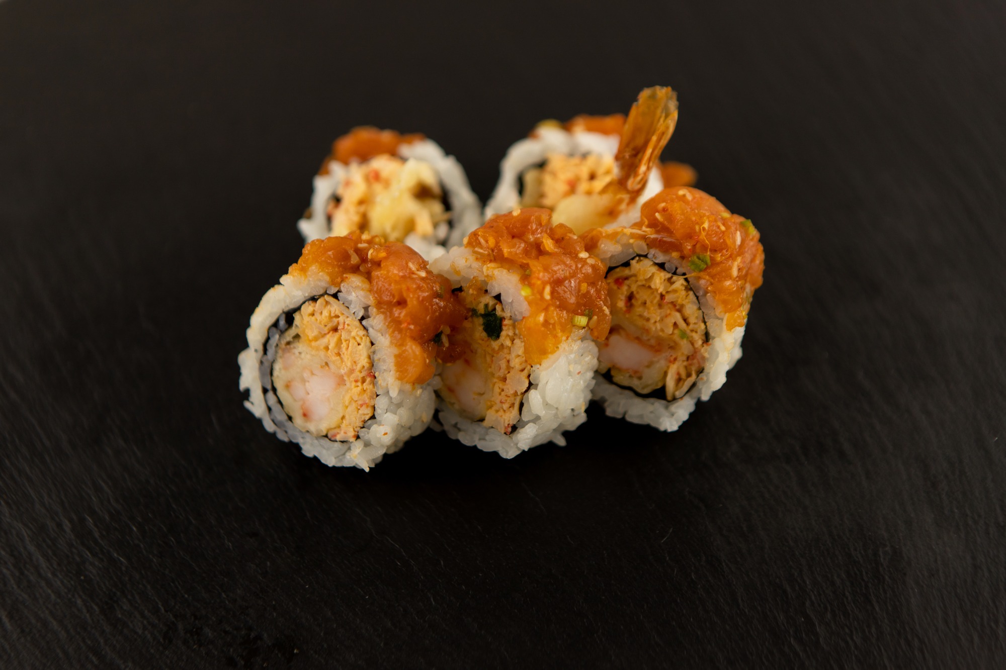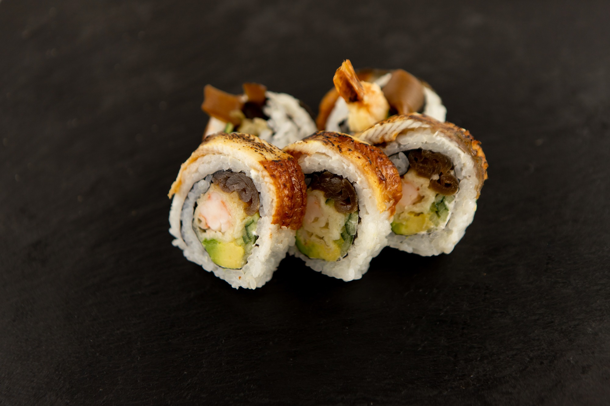 łosoś, cała rolka w tempurze, sos kabayaki, migdały